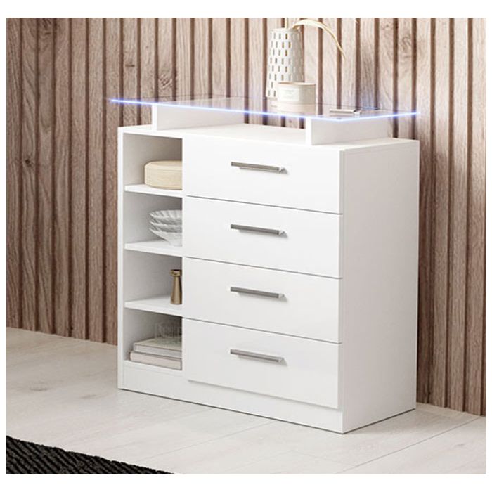 Questo mobile è dotato di quattro cassetti con maniglie in metallo, è ideale per riporre tutti i tuoi oggetti, e di altri quattro spazi visibili per collocare la tua decorazione preferita.