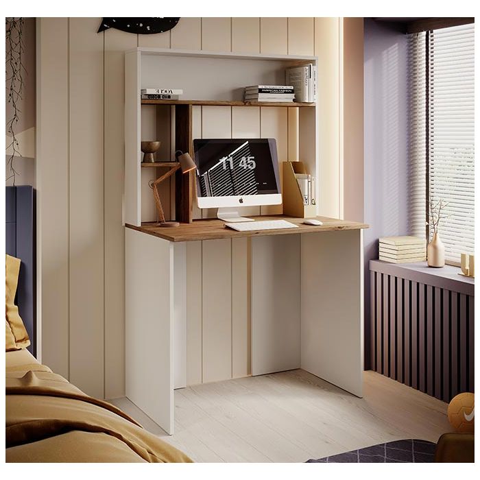 Scrivania Pixel con ripiano (90 cm) in bianco e pino